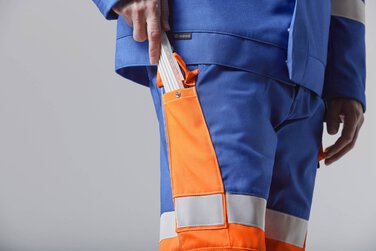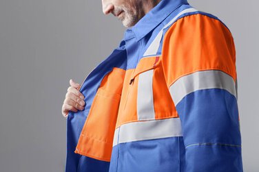Fluorescencyjny pomarańczowo-czerwony kolor i wyraźne paski odblaskowe zapewniają dobrą widoczność – na terenie zakładu, w halach produkcyjnych lub podczas pracy w kamieniołomie.